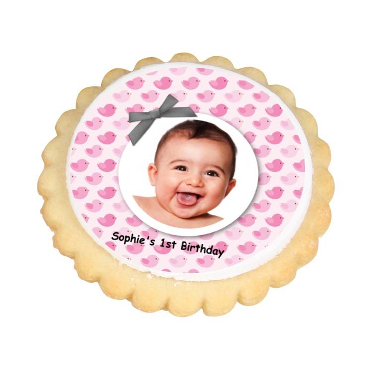 Delicious cookies with a pink ducks and cute bow design and personalised with your photo and message.