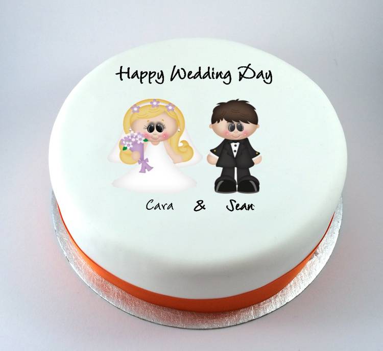Delicious sponge cake with a bride & groom design and personalised with your message. Perfect for a wedding celebration.