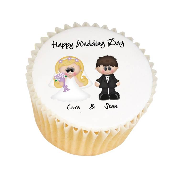 Delicious cupcakes with a bride & groom design, personalised with your message. Perfect for an engagement or wedding gift.
