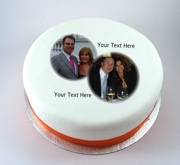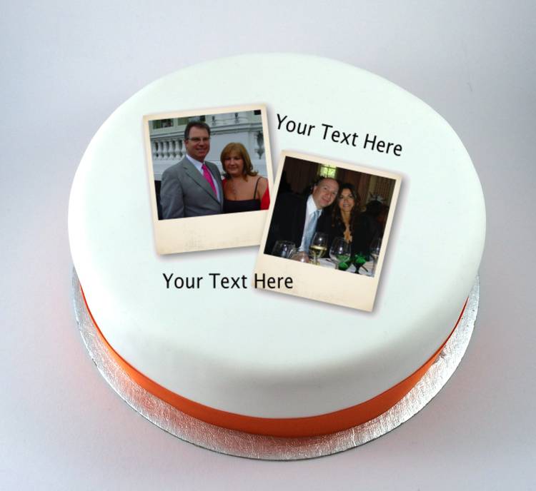 Delicious sponge cake with two square photos in a polaroid style frame or two round photos and personalised with your message.