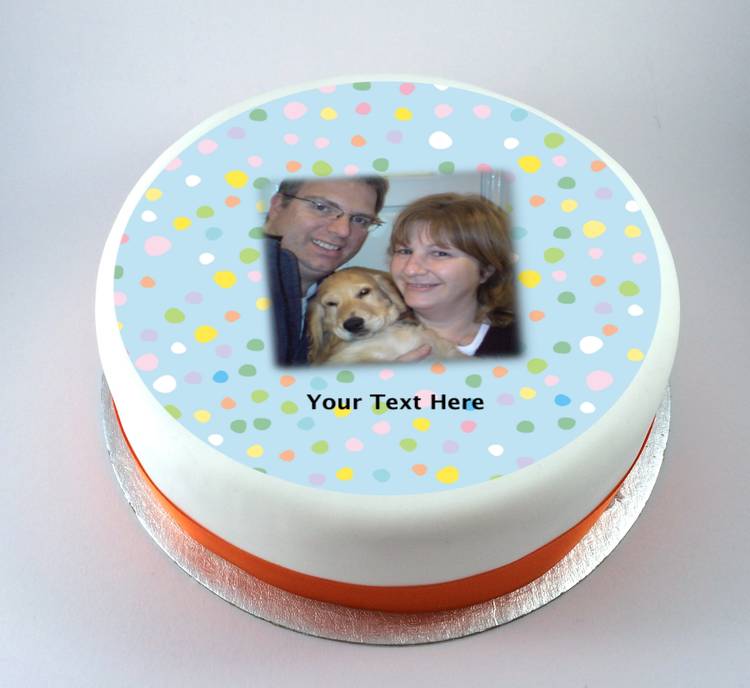 Delicious sponge cake with a dotty design and personalised with your message and photo.