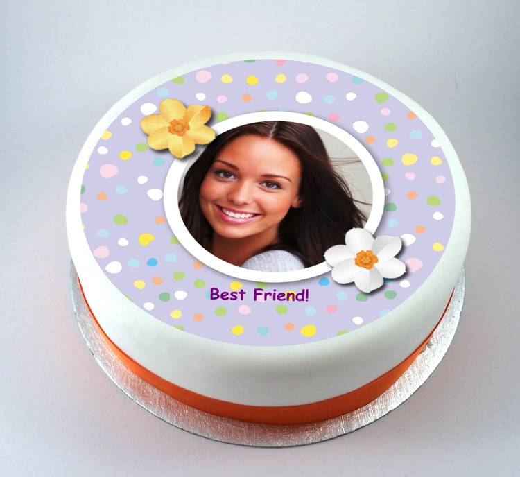 Delicious sponge cake with a lilac dot and flowers design and personalised with your message and photo.